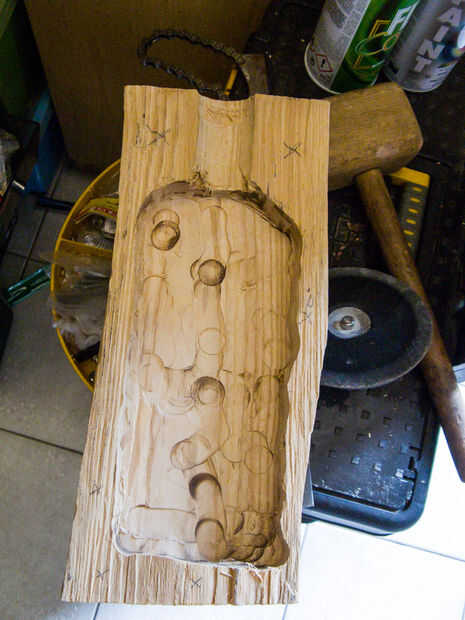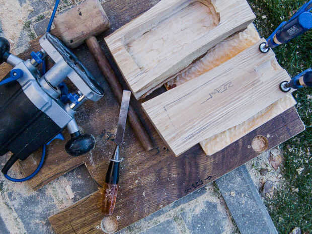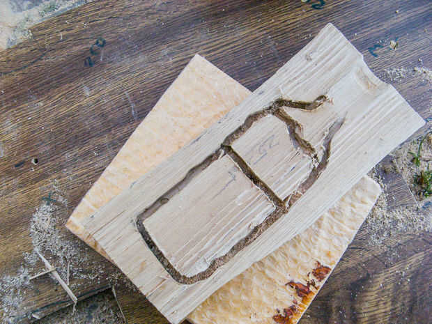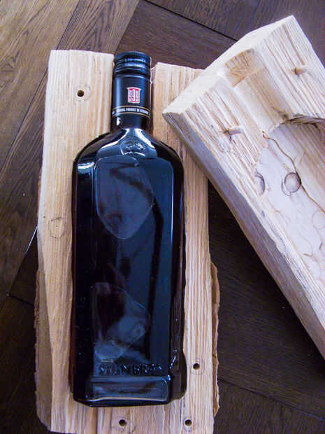 Ahora que has encontrado uno - partirse por la mitad con un hacha y marque los contornos de la botella de ambos lados y a lo largo de las líneas que marcó. Dejé el cuello de botella unrouted y perforados en ambos hemisferios simultáneamente con una frostner poco cuando era claro cómo exactamente la botella va a sentarse, pero efectivamente podría ser enrutado también.