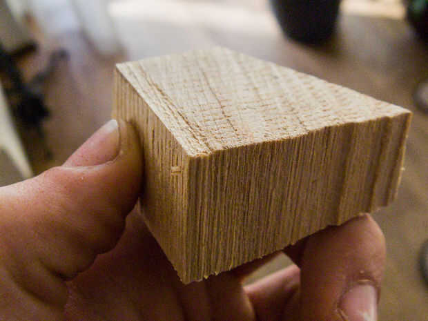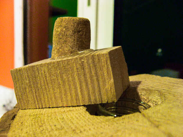 Haber pasado por este gran esfuerzo dejando el cuello de botella con tapa expuesta hubiera sido inaceptable, así que encontró un pequeño trozo de leña, cortar el extremo y caliente había pegado un corcho de vino de diámetro correspondiente a la parte inferior de la misma. Inicialmente trató de caliente pegamento la pieza de madera en la tapa original del giro, pero mi registro tiene una diagonal y el que crea más problemas de lo que pensaba.