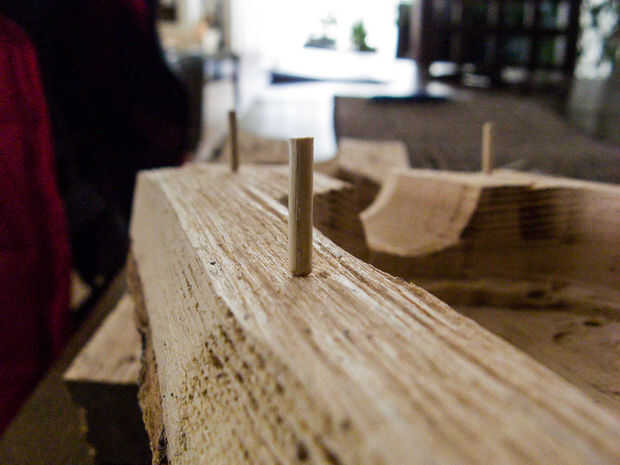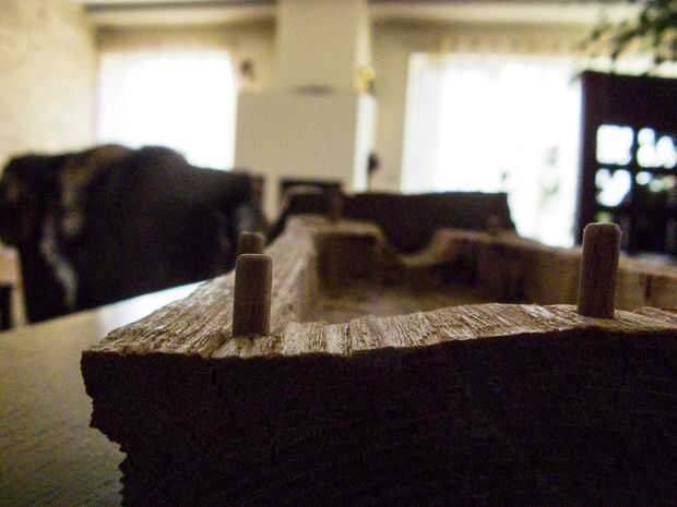 Para unir las mitades usé algunos tacos de Ø5mm. Los lugares para los orificios fueron elegidos simplemente por mirar donde no hay espacio izquierda. Haz los agujeros frente a uno a primer taladro agujeros más pequeños y añadir puntiagudos pinchos apenas superiores a la superficie. Luego juntar las mitades juntas como debe ser y empuje tan duro como usted puede. Esto resultará en marcas pequeñas en el otro lado, se debe perforar allí. Si tienes una técnica mejor para esto - por favor, compartir. Los tacos estaban pegados en sólo la mitad del tronco, dejando por lo tanto la capacidad de abrir el registro y tal vez incluso utilizar otra vez en algún momento.