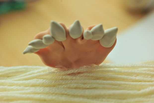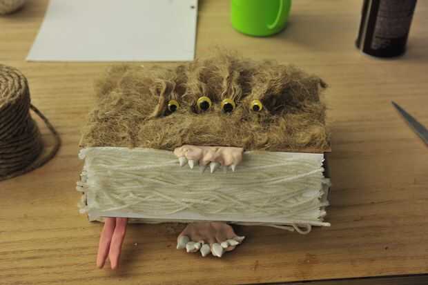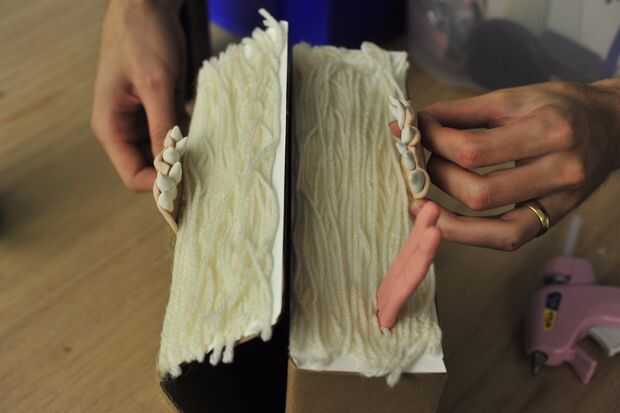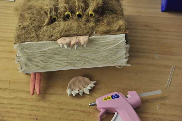 En un intento de simplificar nuestro proceso, nos une la mandíbula inferior con la ayuda de una pistola de pegamento caliente confiable. Después de alinear los maxilares inferior y superior, pegamento caliente se aplicó principalmente en la parte inferior de la mandíbula inferior. Colocar la mayor parte de nuestro pegamento debajo de la mandíbula dio nuestro monstruo un aspecto más limpio. Pegamento que se aplica por encima de la mandíbula fue cubierto con el hilo Unido previamente como páginas del libro del faux. La mandíbula inferior era entonces dado tiempo a secarse y endurecerse en la caja de monster.