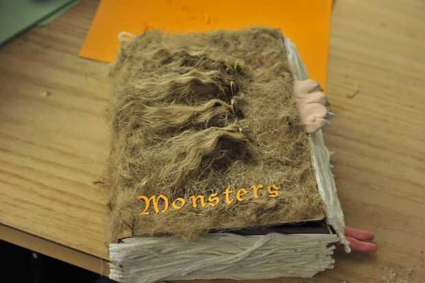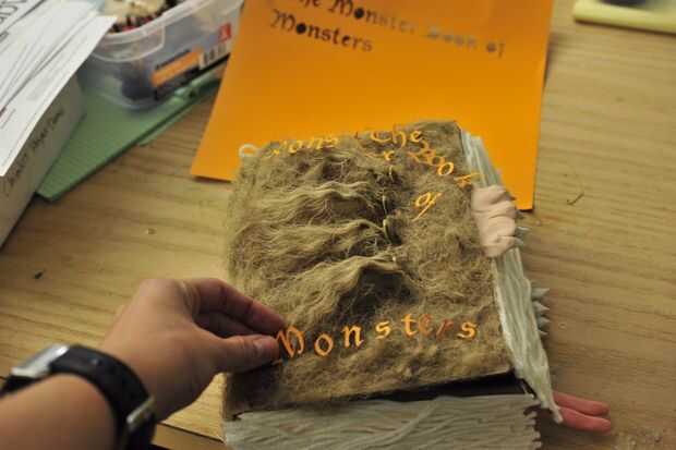 La etapa (casi) final de nuestro proyecto estaba dando nuestro monstruo libro un nombre. Para este paso utilizamos una impresora Silhouette Cameo para cortar nuestro texto basado en el estilo de fuente elegido. Esto simplifica bastante el proceso creativo y hecho nuestro texto aparecen muy pulido. El archivo de texto que creamos, que es el formato para el camafeo de silueta, está disponible para cualquier persona interesada.