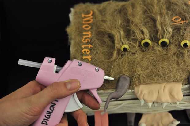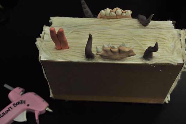 Con nuestra caja monstruo casi terminado, es finalmente tiempo para añadir nuestros tentáculos! Los tentáculos más largos fueron colocados cerca de la mandíbula superior e inferior, mientras que los tentáculos restantes fueron espaciados para adaptarse a lo largo de los lados superior e inferior. Tentáculos fueron Unidos con la ayuda de la pistola de pegamento caliente dandy práctico, y la caja se deja para secar.