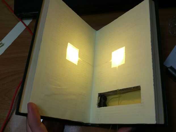 Para terminar, pegué una hoja de papel sobre las páginas para cubrir el circuito y mantener los cables de la mudanza. También usé algunos lija lijar los laterales del libro para eliminar cualquier rastro superficial de pegamento.