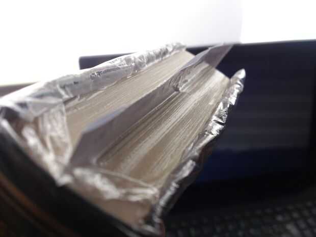 Lo siguiente que queremos hacer es separar las páginas del libro en dos, para ello, contamos las páginas y la mitad de ellos dejan a un lado y la otra mitad al otro lado, ponemos envoltura de alimentos en el medio, por lo que las dos partes no pegan cuando aplicamos el pegamento. A continuación cubrimos la tapa del libro con la envoltura de alimentos, esto evitar el pegamento en él.