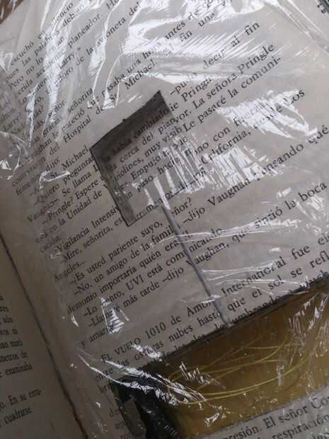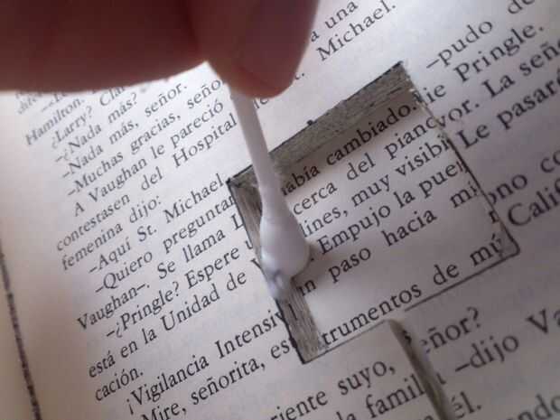 Las páginas son sólo espera por el pegamento en los lados, por lo que cada vez que termines un agujero debe aplicar pegamento a los lados del agujero, como hicimos con los lados del libro, que la empape de cola un poco, después comida abrigo sobre el agujero, cerrar el libro y poner un peso pesado en ella.