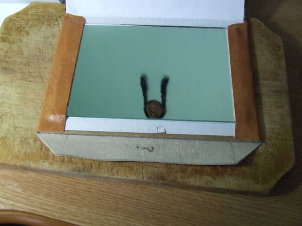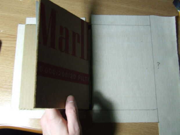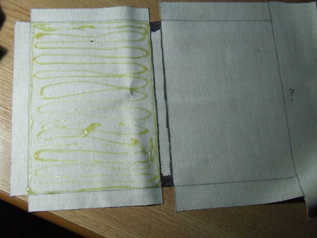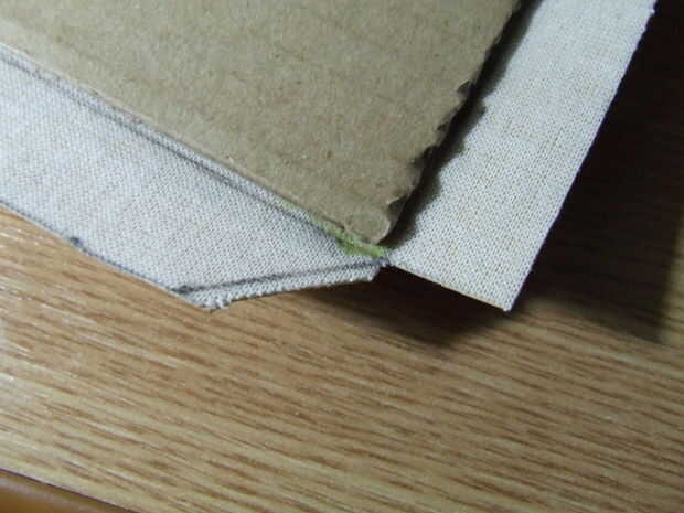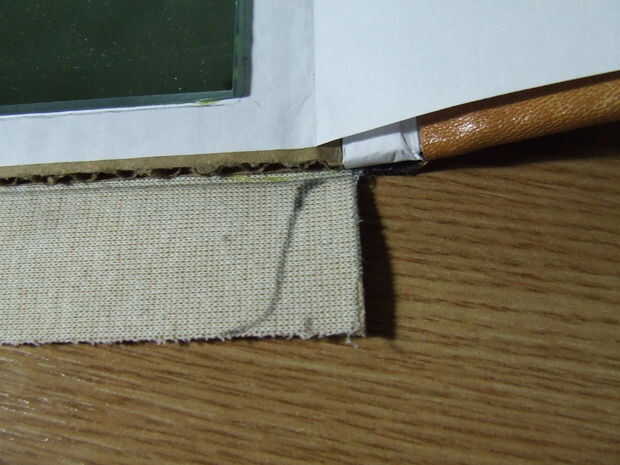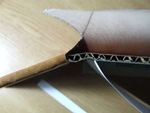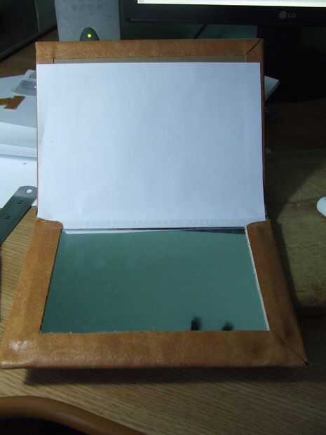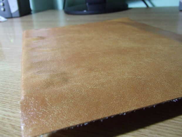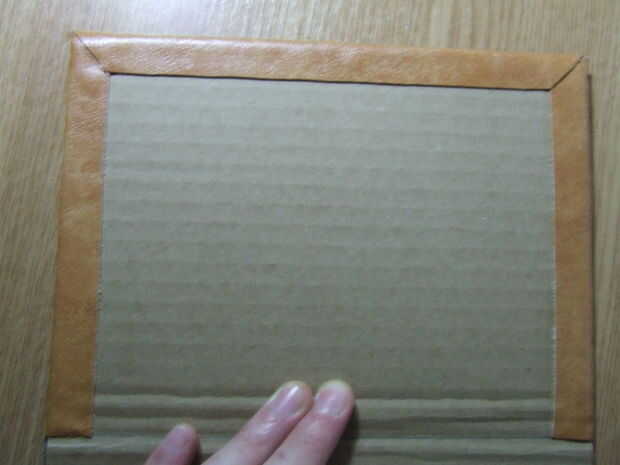 Después de que el cuero artificial es cortado a la medida, pégala a la cartulina: en primer lugar pegar el frente y parte posterior de la cartulina, deje que se seque. No pegue el medio, porque tiene que seguir siendo flexible para apertura y cierre.