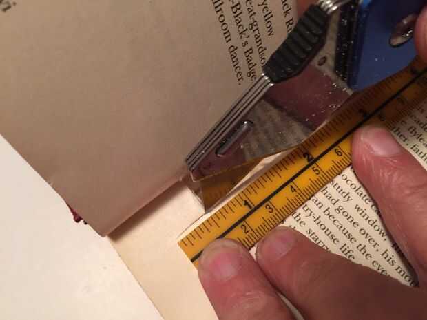 Utilizando la guía siguiente puede comenzar a cortar a través de todas las páginas para producir un largo estrecho pero profundo agujero. Tómese su tiempo y corte siempre lejos de los dedos.