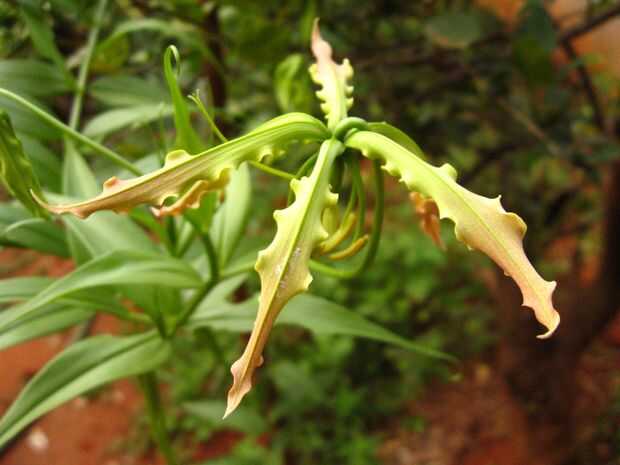 Los pétalos alargados en posición casi horizontal. Los bordes de los pétalos también dado vuelta rojo ligero en color