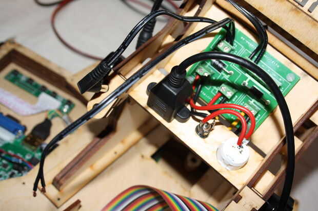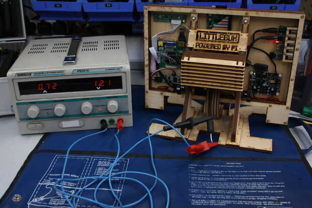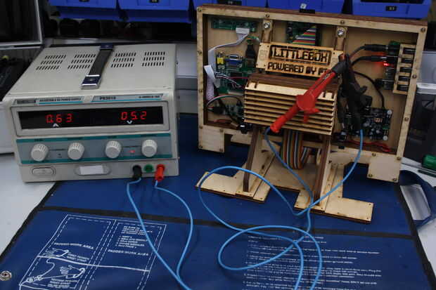 Con todo en el LittleBox atado con alambre, pero sin cualquier dispositivo USB o cualquier sonido que se genera, la LittleBox dibuja 720mA en 12.1v, un total de 7,1 vatios. El Hub USB & frambuesa Pi por sí mismos requieren sólo 3,3 vatios.