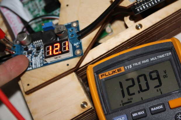 La fuente se muestra en las dos primeras imágenes se puede establecer a un voltaje de salida específico, en este caso 12v y 5v entonces. La fuente también ofrece un medidor de lectura de cuánto corriente dibuja del dispositivo conectado.