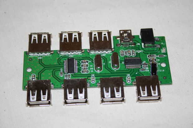 Mi búsqueda de un concentrador USB ha llegado y terminan también. El que he encontrado es todavía 7 puertos, pero el PCB tiene agujeros para tornillos se pernos en lugar de detenidos con almohadillas de espuma como la versión actual.