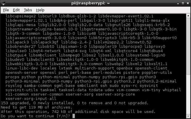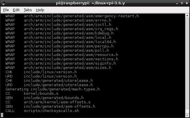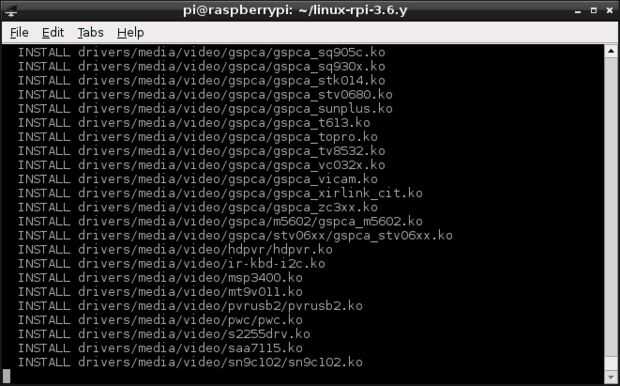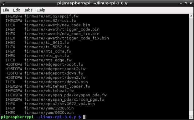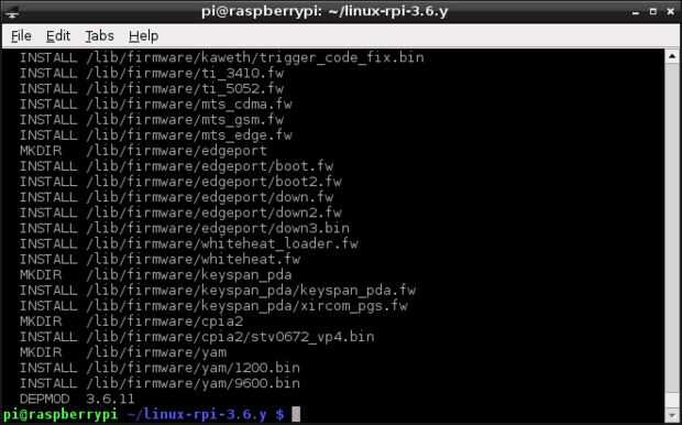 Esto carga una configuración de núcleo de interfaz gráfica de usuario. Hay otras opciones disponibles, para más información abrir el archivo README en el directorio ~/linux-rpi.3.6.y/.