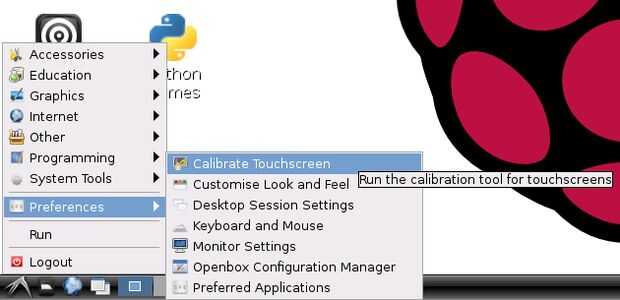 44 | Para cargar el programa haga clic en el icono del programa en la esquina inferior izquierda de la pantalla, vaya a preferencias y haga clic en Calibrar pantalla táctil.