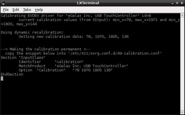 Cuando la calibración haya terminado, se abrirá una ventana terminal con los datos de calibración. Esto debe guardarse permanentemente en un archivo de calibración.