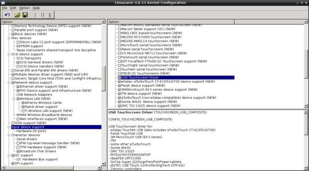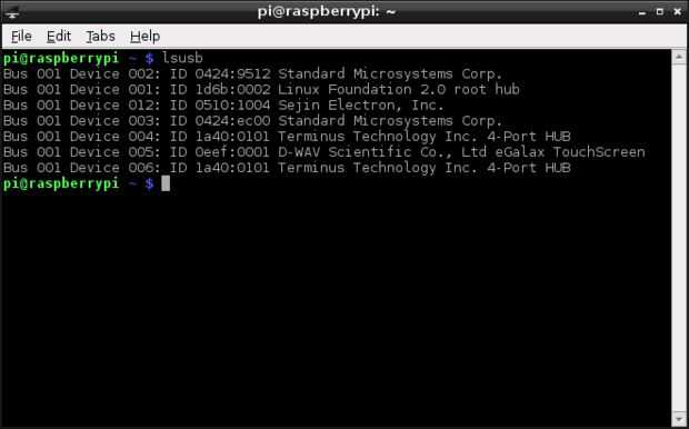 El controlador de pantalla táctil es un eGalax Inc. USB TouchController, usted puede confirmar que el controlador está conectado correctamente al escribir lsusb en la línea de comandos.