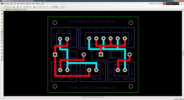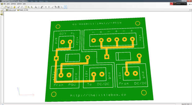 Utilizando el software DesignSpark PCB dibujó un circuito simple. Este circuito le ayudará a mantener el cableado ordenado y caja fuerte. Esencialmente rutas de energía desde la fuente de alimentación al convertidor DC DC, lleva un avance del convertidor y luego permite hasta tres dispositivos ejecutar desde una fuente de 5v +. También hay un + 12v para la pantalla LCD. Ambos circuitos pasan a través de rectificador para protección contra inversión de polaridad.