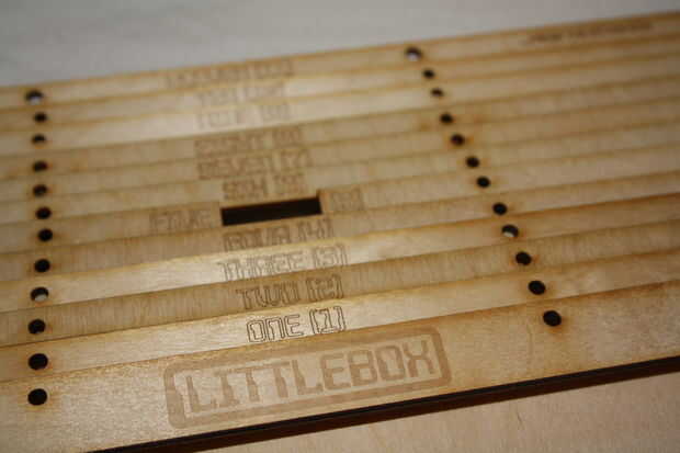 Los chicos de corte corte Laser precio mi diseño con grabado raster había hecho y me aconsejó que podría hacer una gota grande en el costo mediante líneas vectoriales en lugar de grabado completo. Así he cambiado todas las palabras, las instrucciones y números a las líneas de vector azul RGB, pero he dejado el logo LittleBox como es!