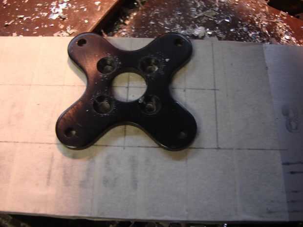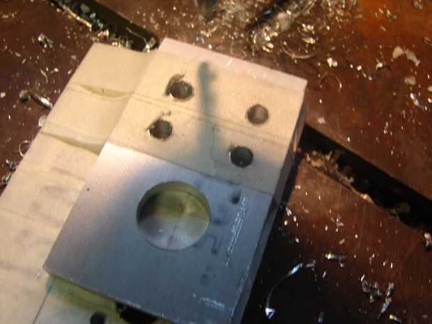 Entonces comencé con la bancada orificios, que tuvo que ser bastante precisos con los tornillos podrían deslizarse a través de ellos y tornillo de la perforación en el motor. Para conseguirlos tan exacto como sea posible utilicé el soporte motor al avión que fue enviado junto con el motor (se trata de un motor de avión RC ;)) Grabó la montura en el aluminio y utilizando los agujeros como guía, perforé derecho a través de ellos. Acabé con cuatro agujeros perfectos.