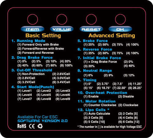 ¡ Y más! (Ajustes más arriba!) Se puede programar utilizando el botón poco establecido en encendido/apagado de la vaina, o puede que sea más fácil en usted mismo e ir a comprar el Hobbywing LED programa tarjeta para Brushless ESC