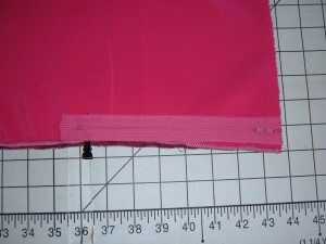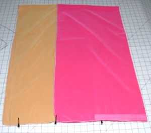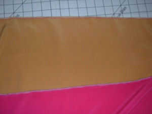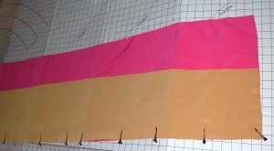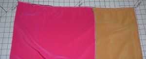 1. Coloque las porciones de la cintura a un lado por ahora. Tomar la pieza principal de la falda rosa y la pieza de mostaza y abrirlos y poner el oro en la parte superior el color de rosa con tocar cada otro pin o clip derecho contra derecho como tal.