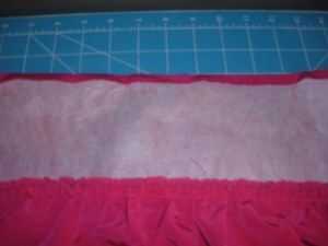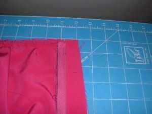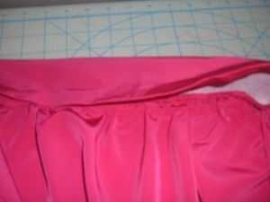 Para agregar la pretina. Con la cremallera abierta, perno de la pieza de cintura a la parte superior de la falda. Debe sobresalir por la mitad una pulgada en un extremo y 1,5 pulgadas en la otra. Coser con un margen de costura de 1/2