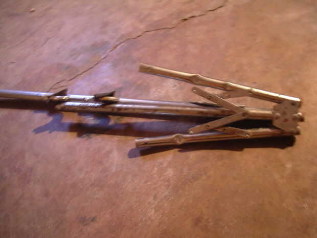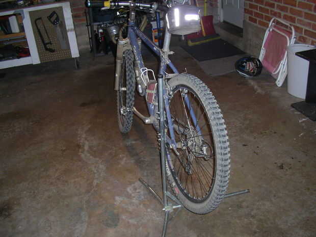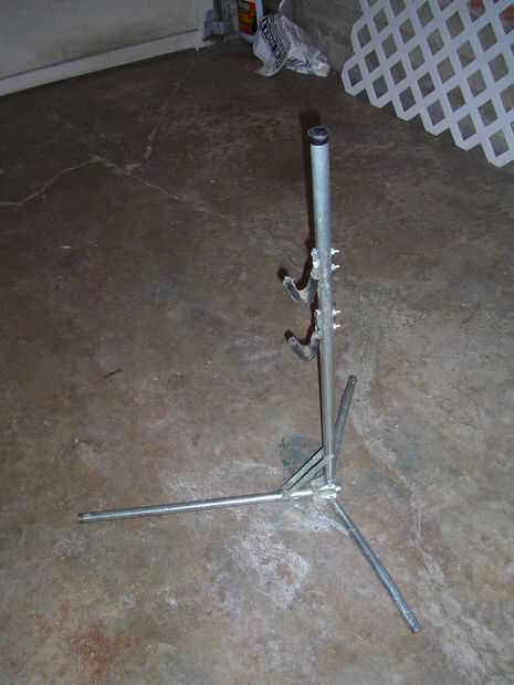 No recuerdo donde conseguí el stand. Creo que solía ser un soporte para colgar ropa en una tienda. No recuerdo Cuánto cuesta, pero siendo el barato tipo de persona que soy, estoy seguro de que no pagar más de unos bucks. Lo compré porque las piernas plegar así que puedo llevar conmigo cuando sigo montando en lejanos lugares. Tenía una parte superior para colgar la ropa. Esto se quita fácilmente con una sierra para metales.