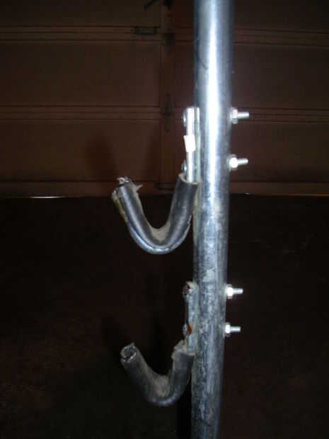 Su la misma idea, pero en vez de clavos, le puse unos ganchos en un stand de ropa que encontré en una venta de garaje. Los ganchos pueden ser originario de cualquier ferretería. No pueden ser más de unos cuantos dólares cada uno. Acaba de obtener un par que es un poco más grande que queda el asiento de tu moto.