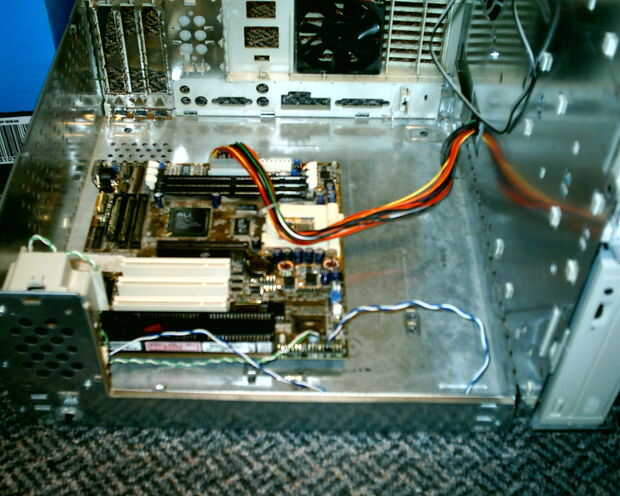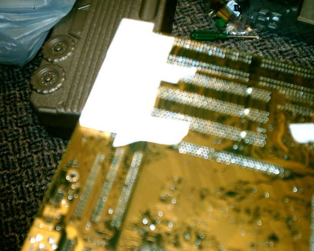 2-Instale las tarjetas verticales y la placa de disquete en la esquina más cercana a las bocas de pci en el caso de la cinta. Esto es necesario, porque si no, la placa madre podría corto en las lengüetas de metal que se