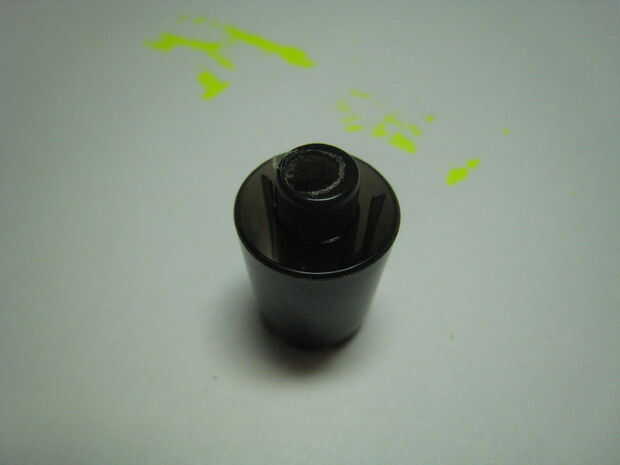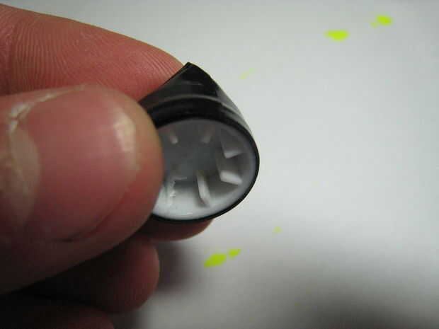 Luego, tomar la tapa del marcador y usar las tijeras para hacer un agujero del tamaño de la pieza pequeña en el extremo de la tapa (ver imagen)