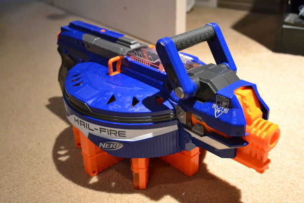 Así que sí, esta es mi arma! En la última foto aquí, muestra la nerf hailfire compré. Culata de pistola muy buena. Ser un arma de élite huelga n dispara casi hasta mi alfa macho aquí. Y esto, la pistola es STOCK!!!! La cosa también tiene 8 clips, para una capacidad máxima de dart de 144 dardos con 18 clips redondos.