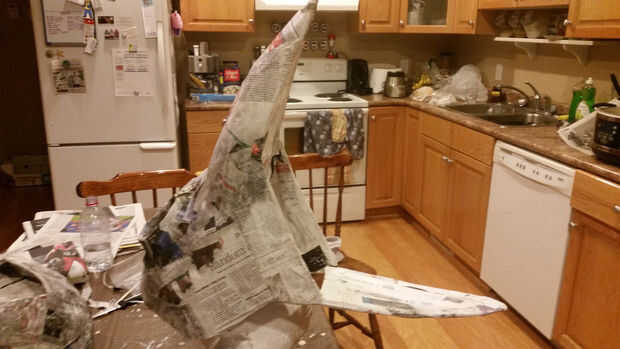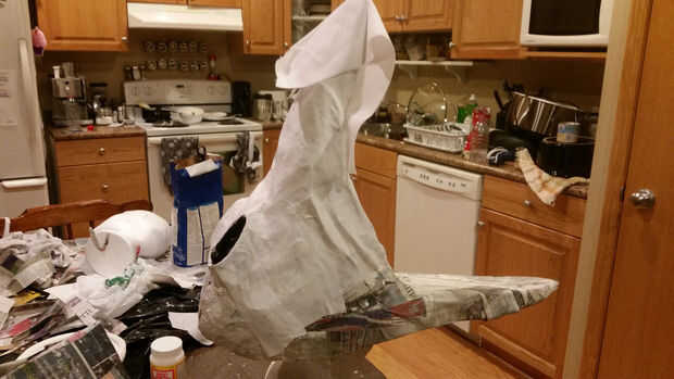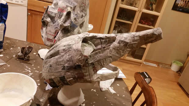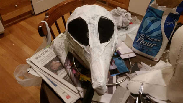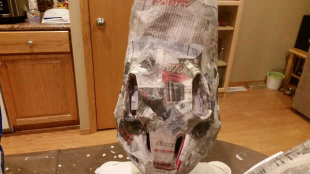 Ahora para la diversión y la parte sucia de la fabricación: papel maché. Usando una mezcla de agua y harina, comenzó a poner las tiras de la mache sobre las cabezas. Asegúrese de dejar su papel maché seco entre capas o corre el riesgo de lo que mohoso. Las dos primeras capas eran sólo construir una base y luego comenzó a crear formas, como zócalos del ojo de Bárbara, rodando encima de papel maché en tiras y moldeado en su lugar.