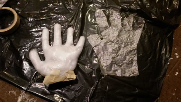 Mientras que las cabezas secas, comencé a trabajar en las otras extremidades que tenía que hacer: de la mano sobre la cabeza de Adán y la lengua en la boca de Bárbara. De la mano, tomé un plástico guante de cocina, relleno de polyfill y cerrarla con cinta. Para la lengua, corte una forma de cartón y forrado con alambre de jardinería flexible (atado con cinta aislante) por lo que pude doblar la forma rizada que necesitaba. Entonces repetí ambos pasos de papel maché en ambas piezas
