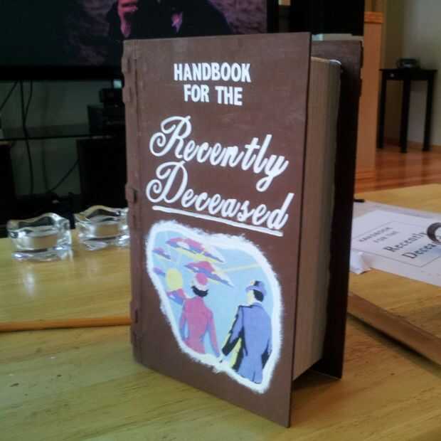 También necesitamos un manual para el recientemente fallecido. Para eso fui a la tienda de arte y compró una caja de libro de papel maché. Pintado sobre el cuadro en marrón, agregué algunos stick en letras se escribe el título y pegado en una impresión de la imagen del libro de la película. La gran cosa sobre el uso de una caja de libro en lugar de solo un libro es que se puede utilizar como un bolso de embrague. Cuando mi marido no estaba usando sus ojos, los almacena en la caja de libro.