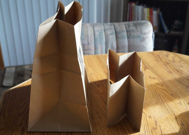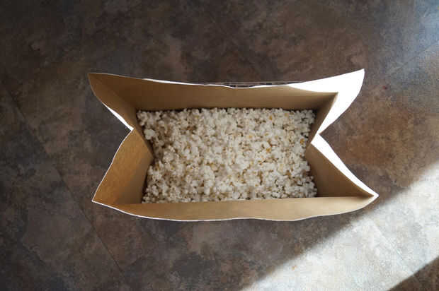 (Primer corte de una gran tienda de comestibles marrón bolso 1/4 de la parte superior de aproximadamente 5 pulgadas hacia abajo como se muestra en la imagen) pone las 18 tazas de palomitas de maíz hecho estallar en la bolsa