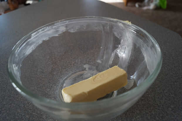 En un recipiente para microondas de vidrio tome la 1 barra de mantequilla (preferiblemente a temperatura ambiente) y traza el interior del borde superior del recipiente o si tiene un (cuarto de 2 galón vidrio Pyrex vidrio medida que sería la mejor mina se rompió) con el palo de mantequilla. Esto ayudará el jarabe más cuando la temperatura se eleva.