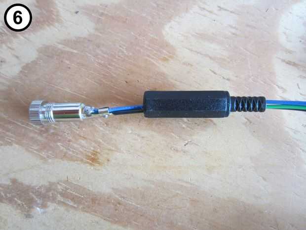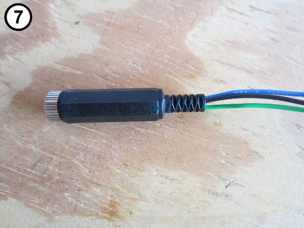 4. Colocar y soldar los cables verde y azul a un 1/8 stereo audio jack inline (fotos 4).