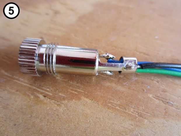5. Colocar y soldar el cable negro a la ficha de suelo grandes en la toma de audio (Foto 5).