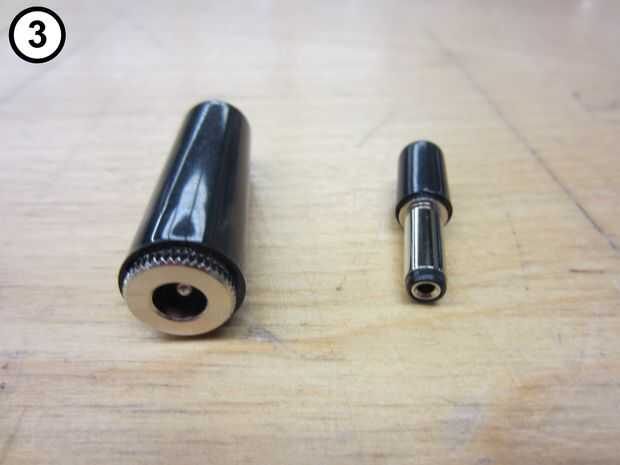- 1 DC enchufe Coaxial tamaño M - Radio Shack 274-1569 (Foto 3, derecha)