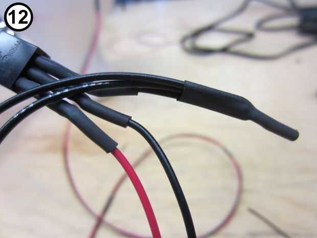 13. Cortar un trozo de tubería del encogimiento del calor y deslícelo sobre la conexión expuesta y encogimiento (foto 12).
