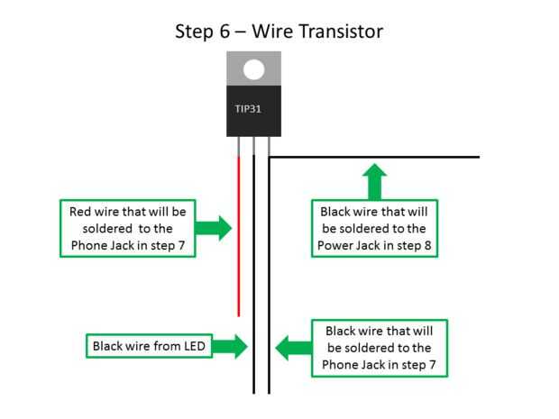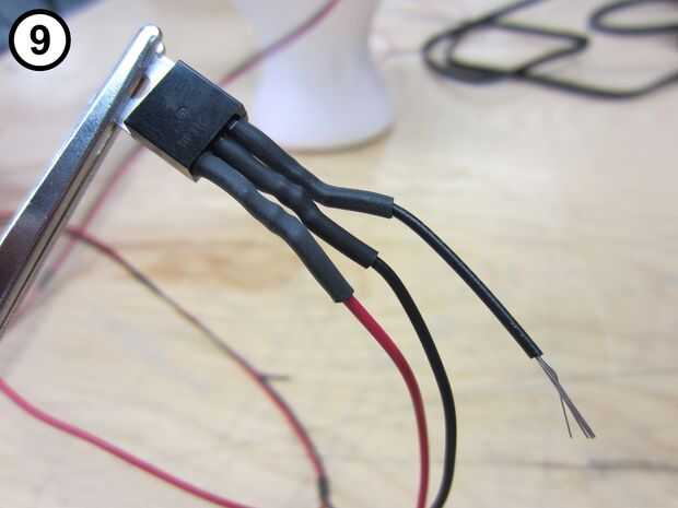 10. Corte una longitud de 12" de alambre negro, ambos extremos de la tira y conecte un extremo del cable negro corto la delantera derecha del transistor (foto 10). Este cable irá a la toma de teléfono en el paso 7.
