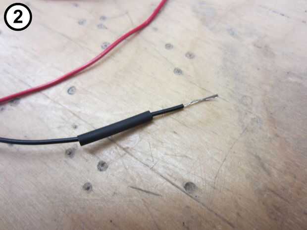 2. Corte una 1/2" pieza de calor tubería de encogimiento y deslícelo sobre el cable negro del LED (Foto 2).