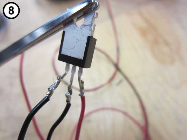 8. Colocar y soldar un extremo del alambre a la delantera derecha del transistor (Foto 8).