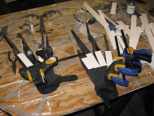 Para cerrar estas cavidades de dedo, usé los cortes fuera de cuando arrancaron los espacios en blanco a la anchura. Adhesivo de PVC y un gran trabajo de abrazaderas, solo no te descuidado debido a se derrita/deformación las superficies externas de las cuchillas en forma. Cualquier borde saliente fueron rápidamente limpiado para arriba y en forma de archivo y papel de lija.
