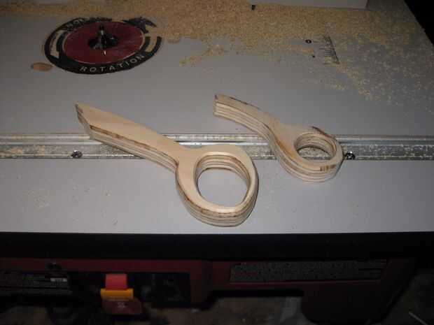 Entonces formas de mango se cortan en la sierra. O agujeros del dedo fueron creados utilizando el taladro y luego en forma alargada usando la lijadora oscilante del huso. Los bordes expuestos fueron redondeados sobre en la mesa de fresadora y luego todas las piezas se lija suave.
