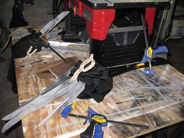 Utilicé madera contrachapada para la mayoría de los mangos que pensaba añadir una textura diferente y le gustaba la apariencia de las capas alrededor de los bordes. Tuve algunos problemas para algunos de ellos pegado al PVC con epoxi... les gustaba alojarse en el lugar ya curó y sujeción no era muy fácil. Debido a esto, terminé consiguiendo epoxy en acabado plata, lo cual se puede ver en el producto terminado porque tomó pintura diferente de otras áreas de la PVC. Hacer las asas fuera de stock PVC funcionaría igual de bien y se puede usar pegamento del PVC para un enlace más rápido.