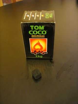 Se hace de cáscaras de coco molido, en forma de un pequeño 6 cm cúbicos que es perfecto y muy práctico para cachimbas, razonablemente rápidamente, se mantiene encendida y tiene una duración de una hora que es la duración media de una sesión de fumar.