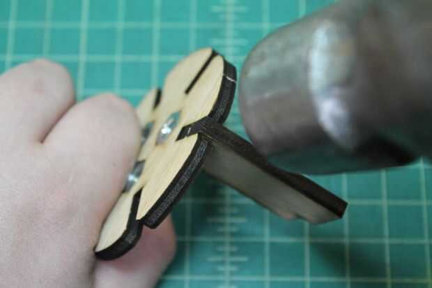 Presione uno de los puntales de la base en una de las placas de base interna hasta que asiente firmemente. A continuación, utilice un martillo para fijarla dentro. Repita este procedimiento con la otra placa base interior.