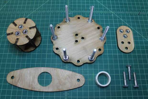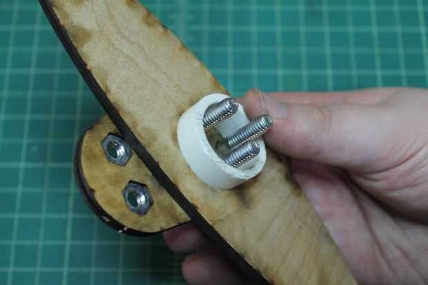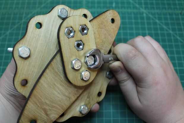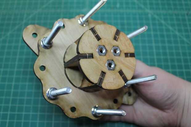 Lugar hexagonal pernos por los orificios de la placa del cigüeñal y el eje de PVC, luego colocando la Asamblea a través del agujero central en el soporte base. Deslice la placa de base externa en los tres pernos hexagonales, luego asegurarlos todos juntos, apretando los pernos del maleficio en el núcleo interno con uno de su llave de 7/16".