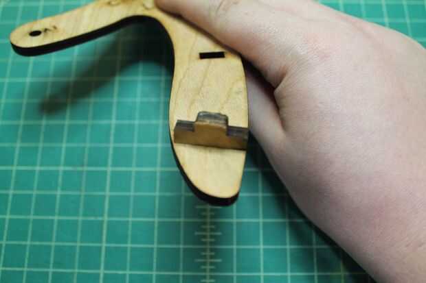Con la inscripción mirando hacia usted, golpee suavemente uno de los puntales en uno de los agujeros rectangulares hasta que se asiente ligeramente (apenas como con el hombro) usando el martillo. Libra el puntal el resto del camino hasta que las pestañas queden al ras con la superficie. Repita para los otros dos puntales