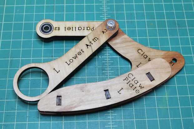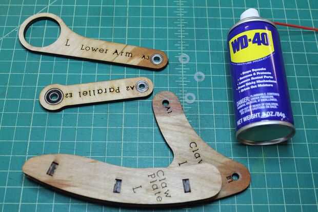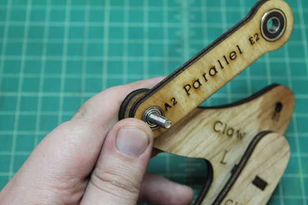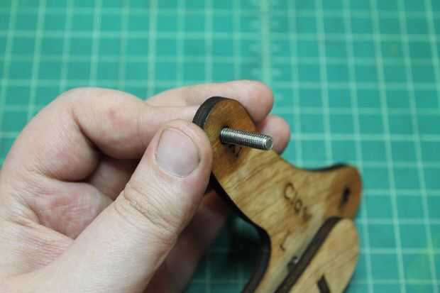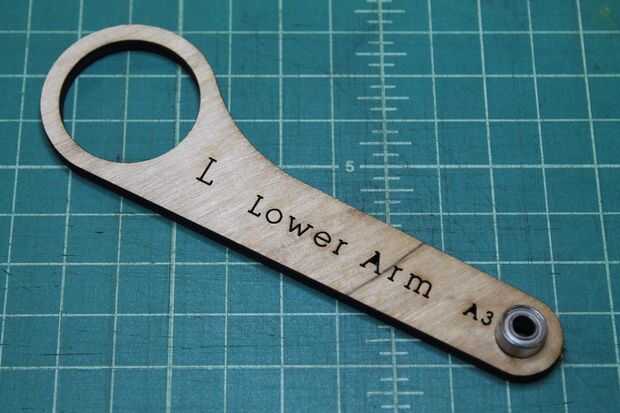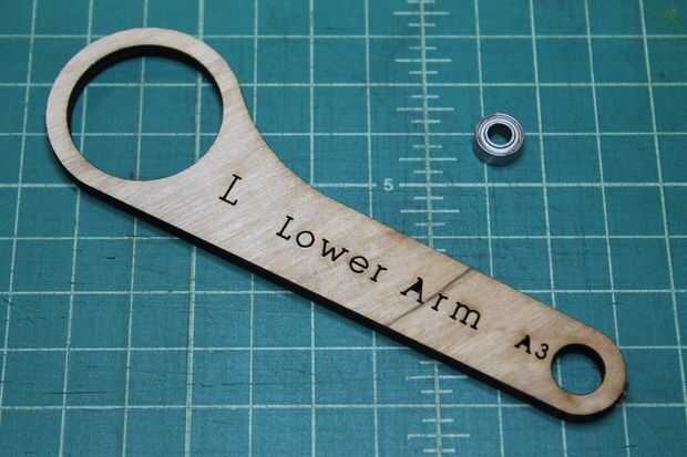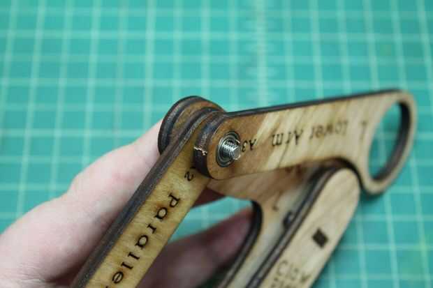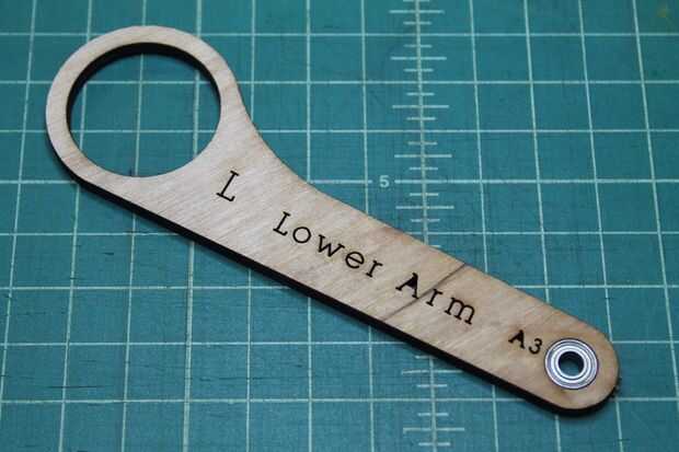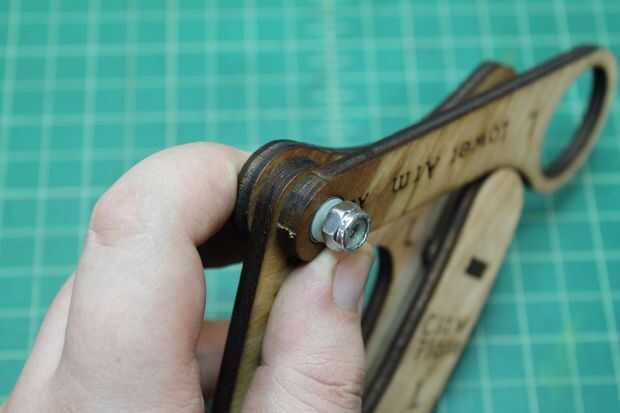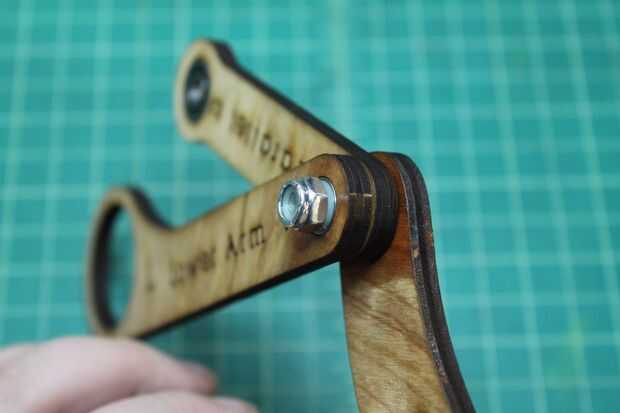 Tome el 7/8" tornillo y empuje a través del orificio marcado A1 de la parte trasera (no Letras) en la parte delantera (con letras). A continuación, lugar uno de los espaciadores de Nylon sobre el perno, seguido de la URL a través del orificio marcado A2. Deposite otra espaciador de nilón, seguido por el brazo inferior por el agujero marcado A3. Por último, coloque el espaciador de Nylon otro spray algunos WD-40 entre cada una de las piezas de madera contrachapada a lo largo de los pernos e instale la tuerca de bloqueo.